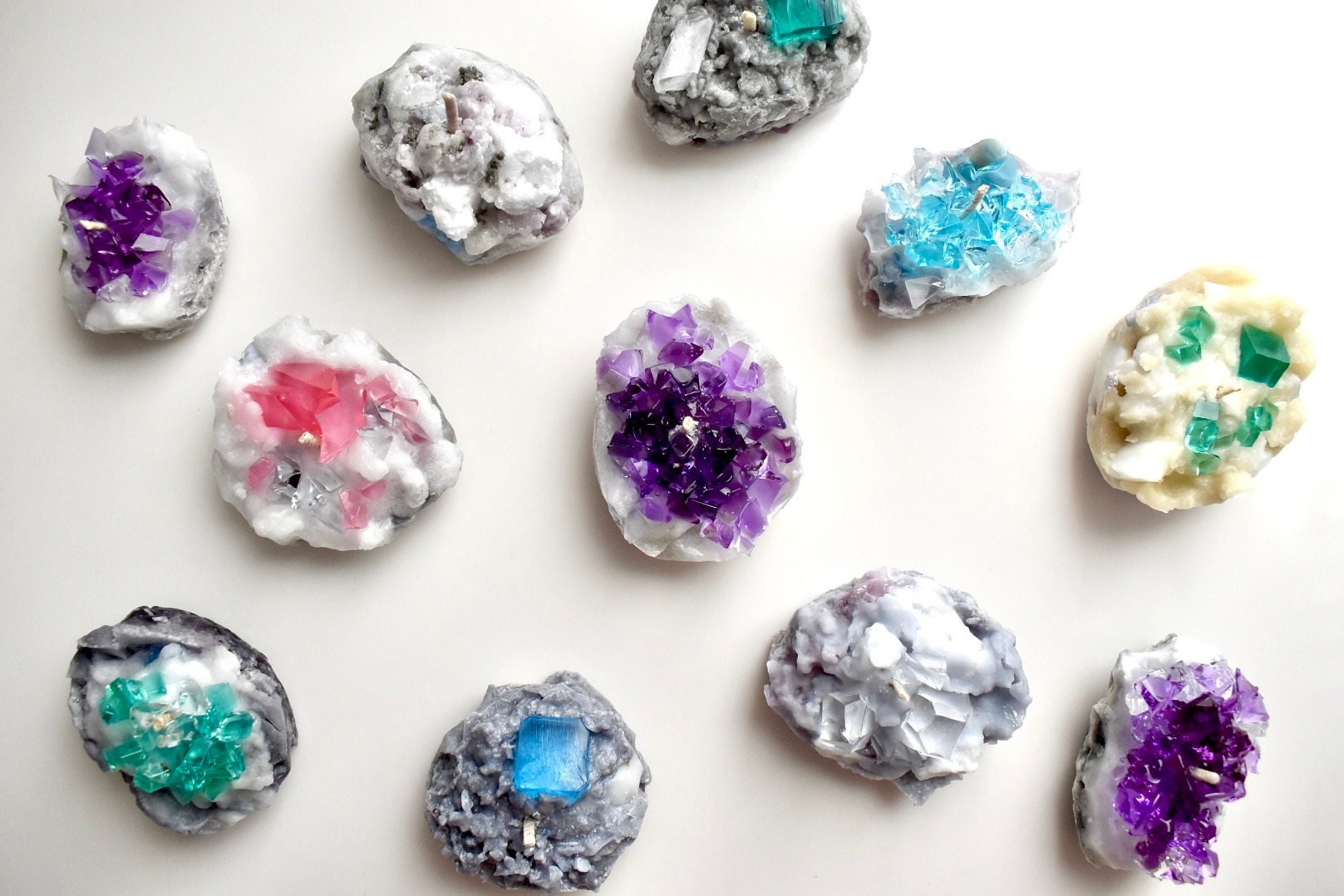 今回はジェルワックスのカケラを乗せた鉱物キャンドルたちをたくさん作りました。