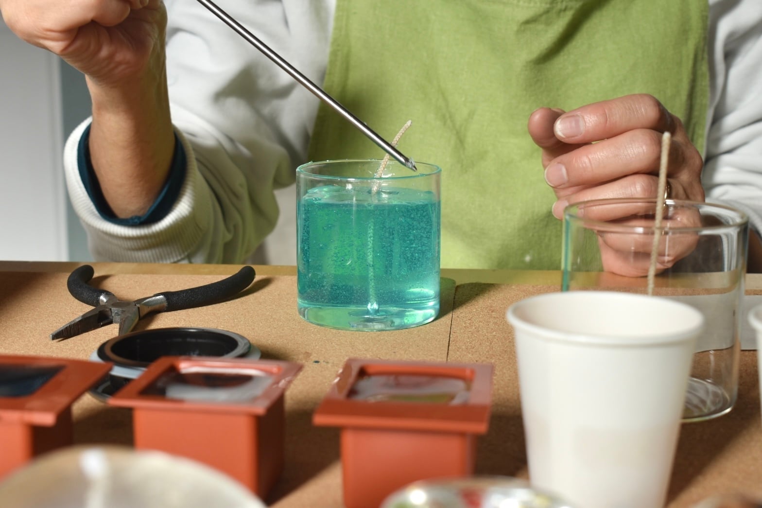 ワックスの計測方法、溶かし方、温度の計測方法から、ワックスへの着色方法、顔料の扱い方、モールドや容器への流し込み、気泡の作り方、芯のセット方法など